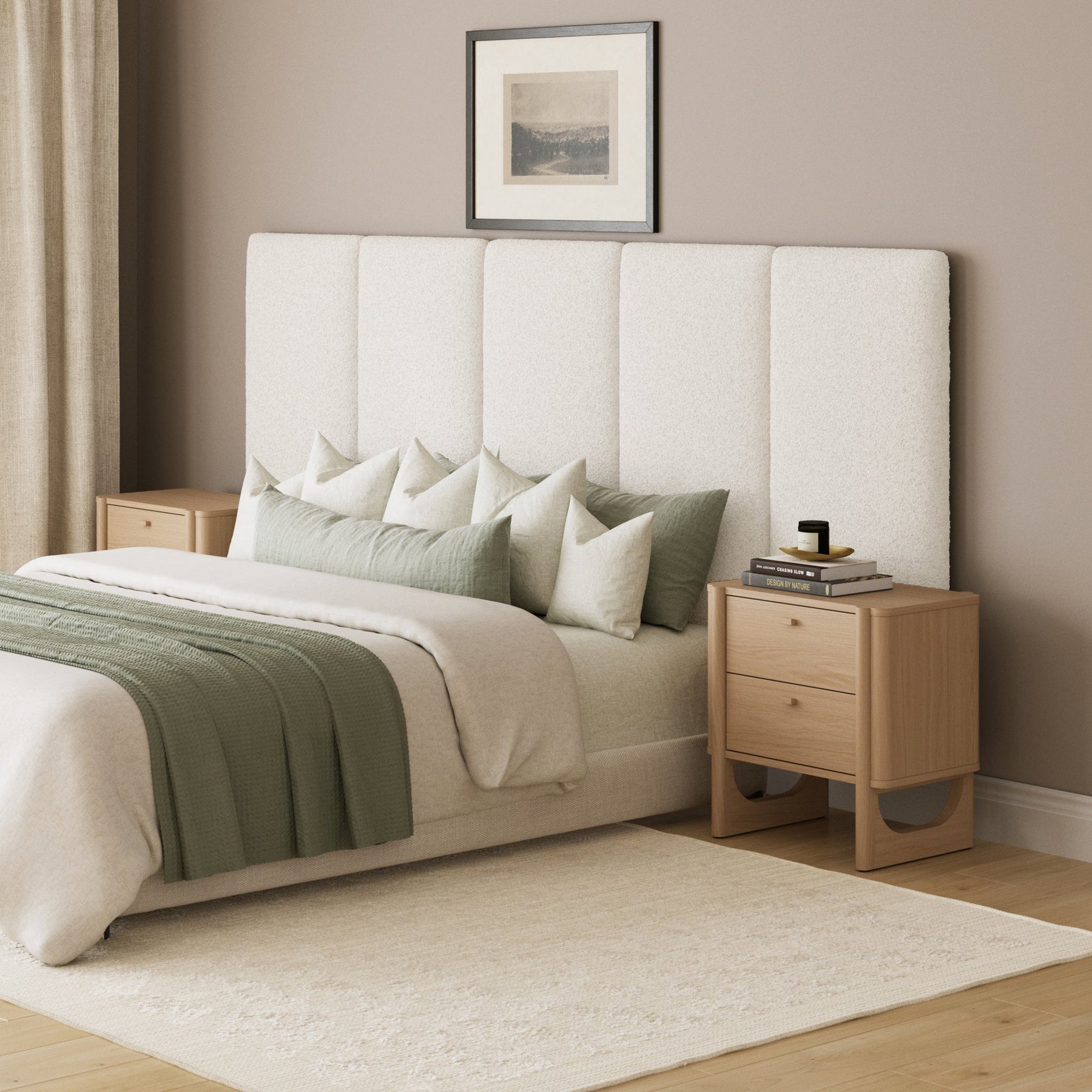 Elevate your bedroom with the Marissa Headboard, featuring wall-mounted panels upholstered in textured boucle for a clean, mid-century modern look. Designed to mount at any height—including directly on the floor—Marissa offers flexible styling that fits your space. Made for a queen bed, its extra-wide panels extend well beyond each side for a bold, oversized look. Holstered panels make setup simple for a sleek, tailored upgrade to your bedroom.