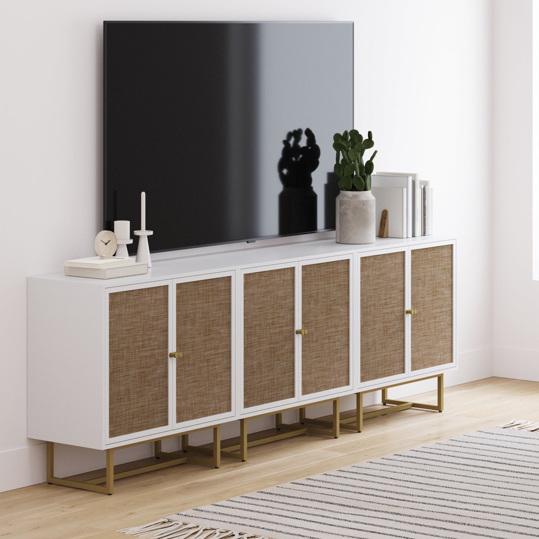 Metal and Rattan TV Stand Console for TVs 85" White