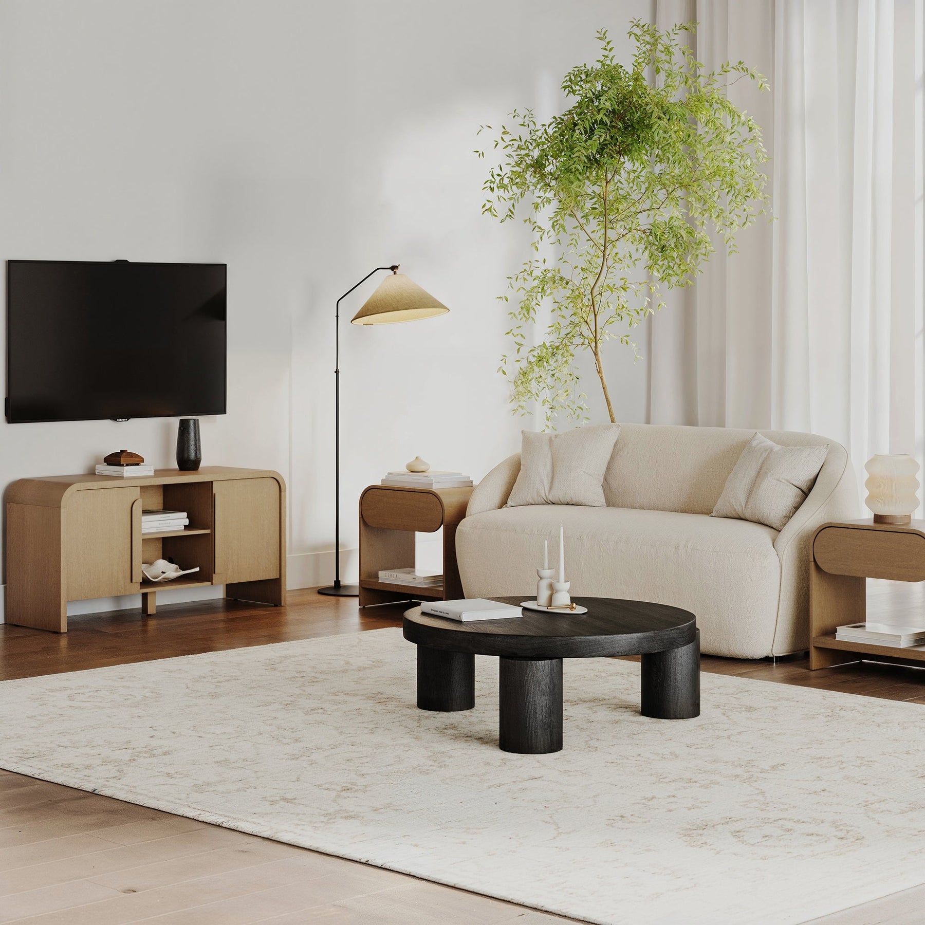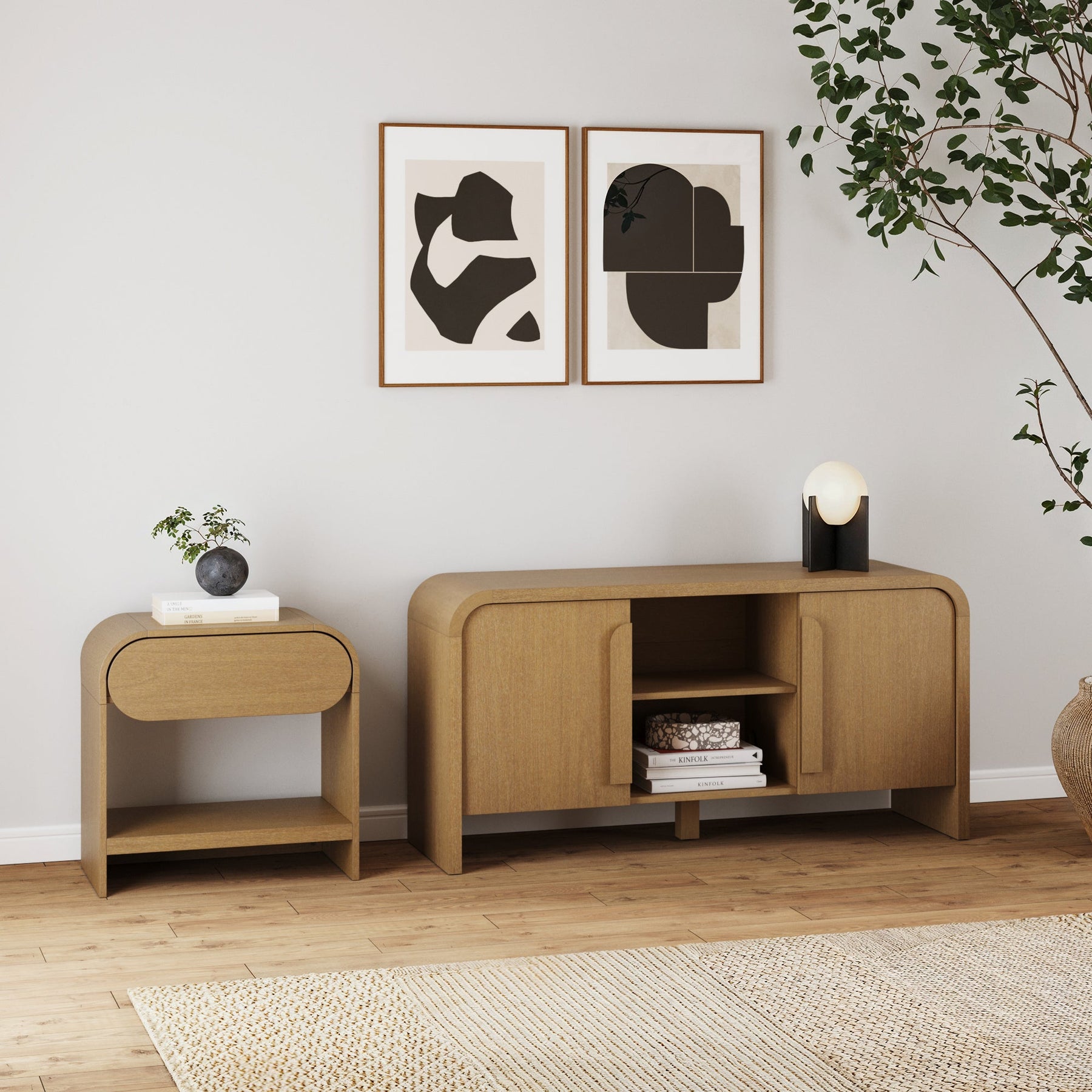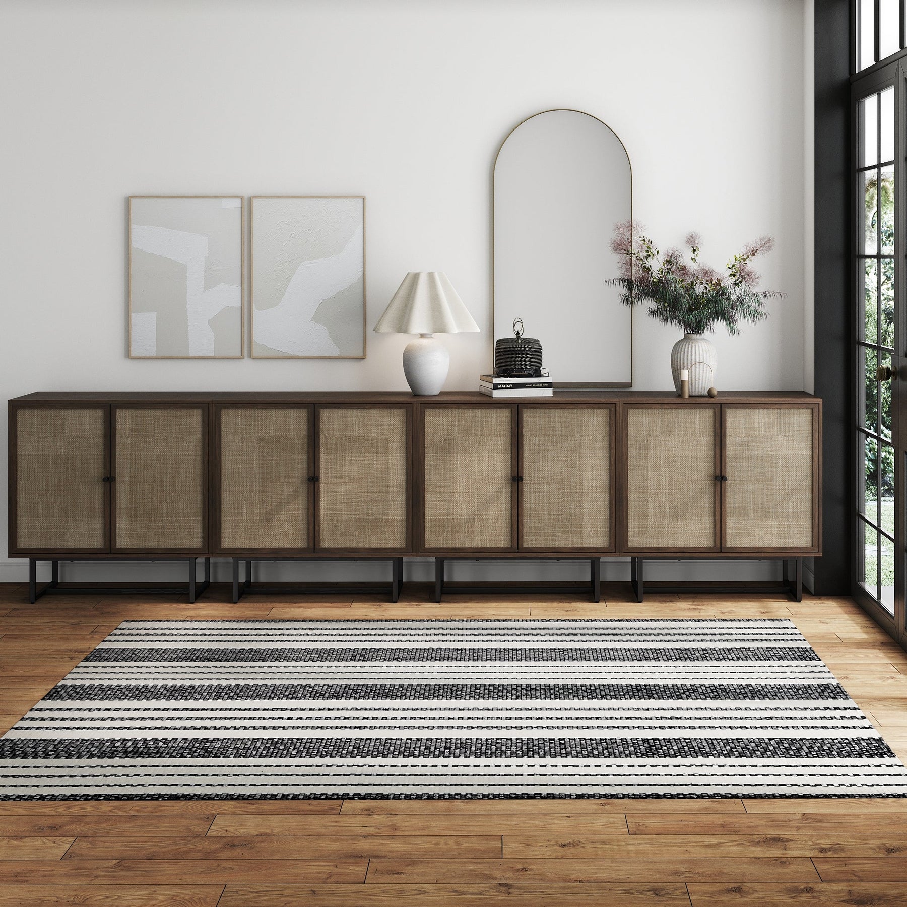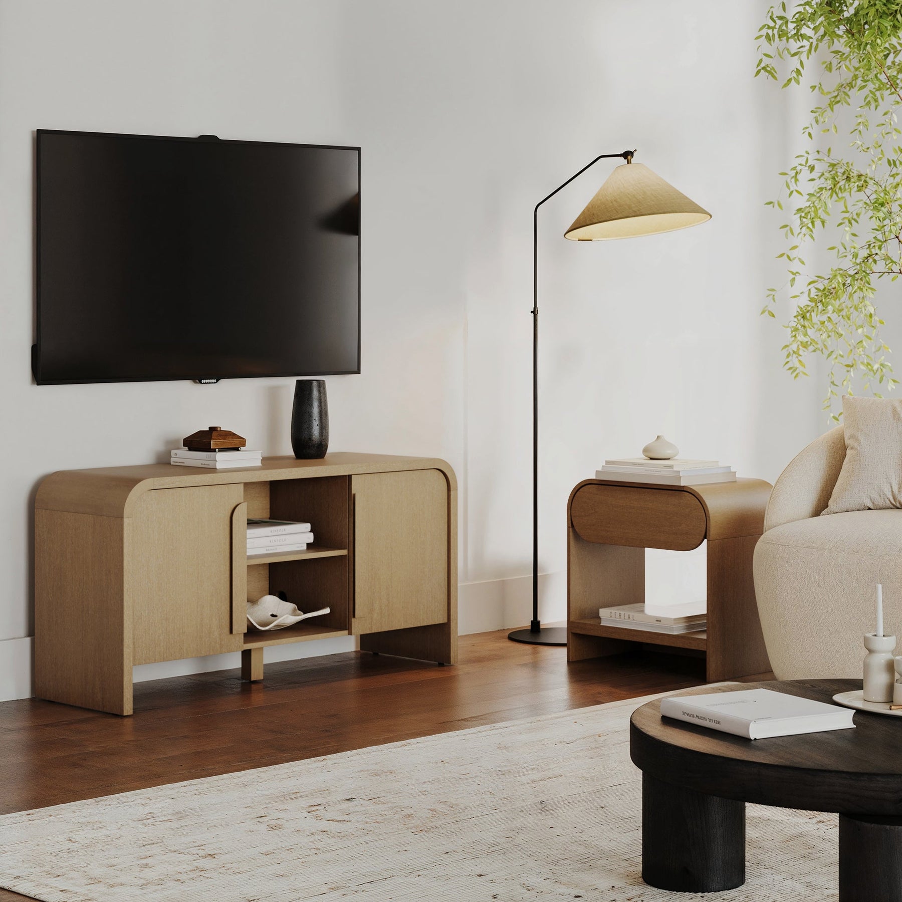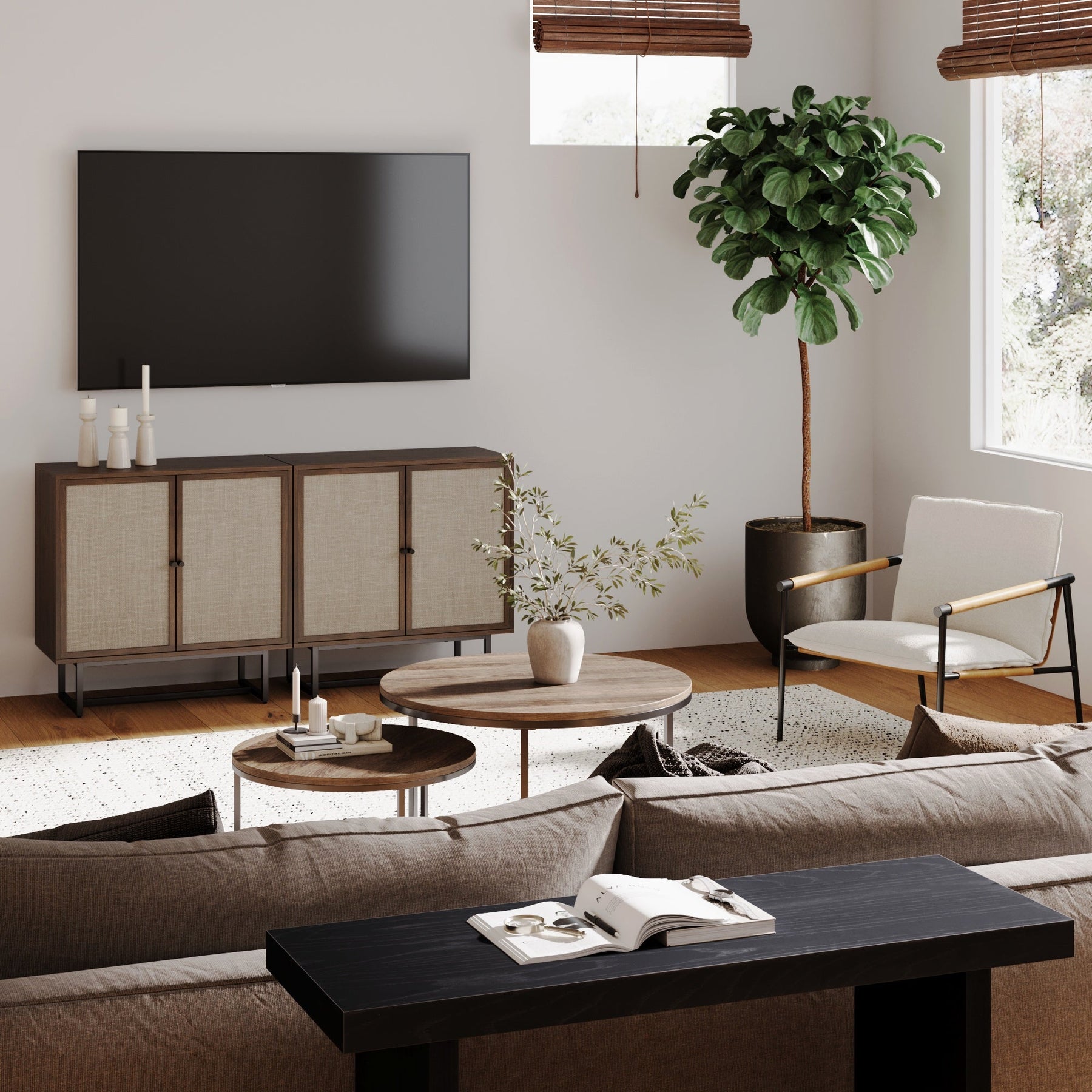Meet Kova—a TV console cabinet with woven textilene door details and a sturdy metal base with leveling glides. Featuring two adjustable doors, an interior shelf, and a 90 lb weight limit on top, Kova blends function with modern charm!